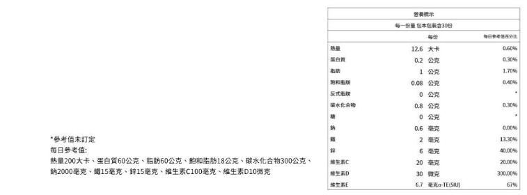 DL-蛋胺酸、麩胺酸發酵物(糊精、專利麩胺酸發酵物(含GABA))、膠原蛋白(專利魚鱗膠原蛋白)、葫蘆巴萃取(專利葫蘆巴萃取物、二氧化矽)、葡萄糖酸鋅、大豆萃取(含大豆異黃酮)、啤酒酵母發酵物(啤酒酵母粉、菸鹼酸、泛酸鈣、維生素B1、維生素B2、維生素B6、生物素、葉酸、維生素B12)、維生素C、維生素D3、紫蘇籽油等。